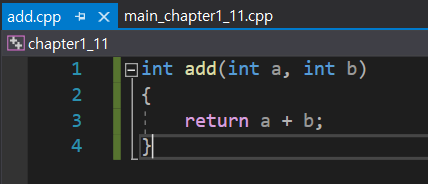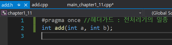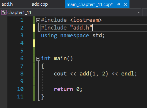 main.cpp파일로 돌아와서는 간단히 #include "add.h"을 추가하면 본문에서 함수이름을 불러와 쓸 수 있다.