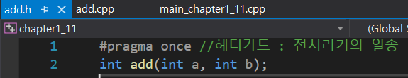 앞서 함수의 정의를 cpp파일에, 함수의 선언을 header파일에 쪼개어 정리하는 방법을 배웠다.