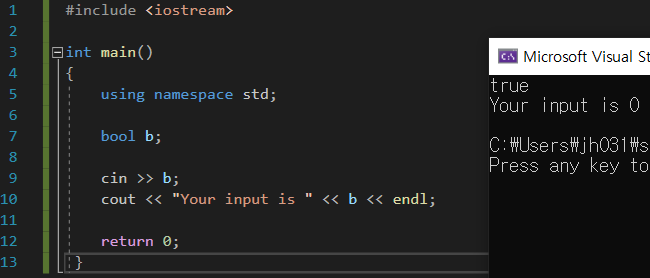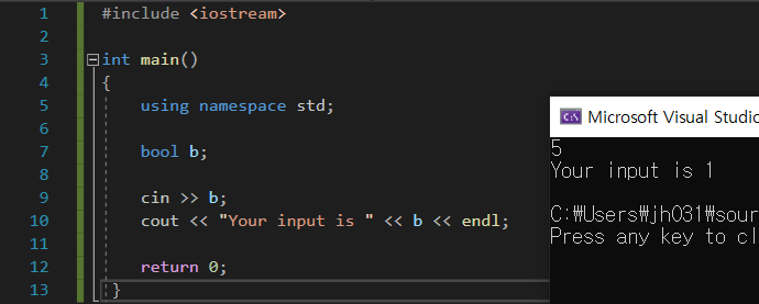 bool 자료형의 변수를 만들고 입력을 받아보자.