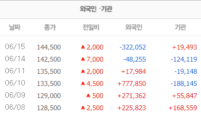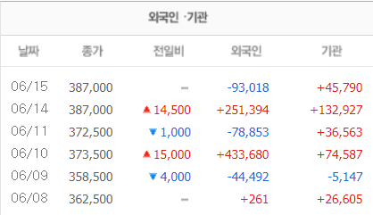 보수적으로 보았을 때, 주식에 대한 사람들의 관심으로 지수 역시 상승하고 그 속에서 IT대장주들이 관심을 한몸에 받고 있다. 당기순이익의 약 80배에 달하는 시총으로 매우 고평가돼있다고 생각된다. 지금의 가격에서 누구도 다가서기 어려워 보이지만 많은 개인들이 매수세를 보이고 있다. 외인들은 매물을 내놓기 시작했지만 주가는 더 상승하였다. 아직 매물을 갖고 있는 외인들이 어떻게 움직일까.