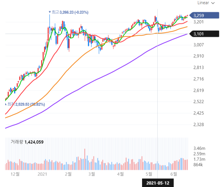 21.05.21일 60일선에 닿은 뒤 완만히 반등하고 있다.