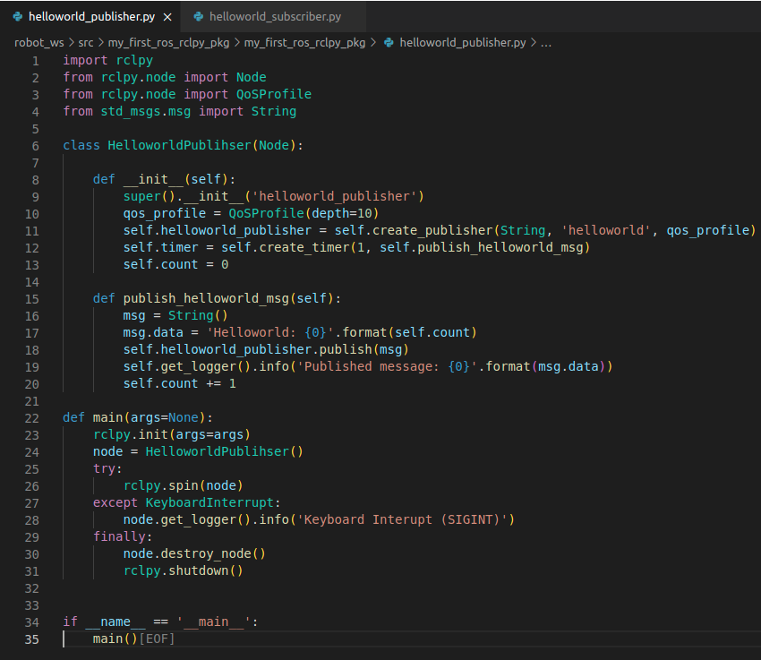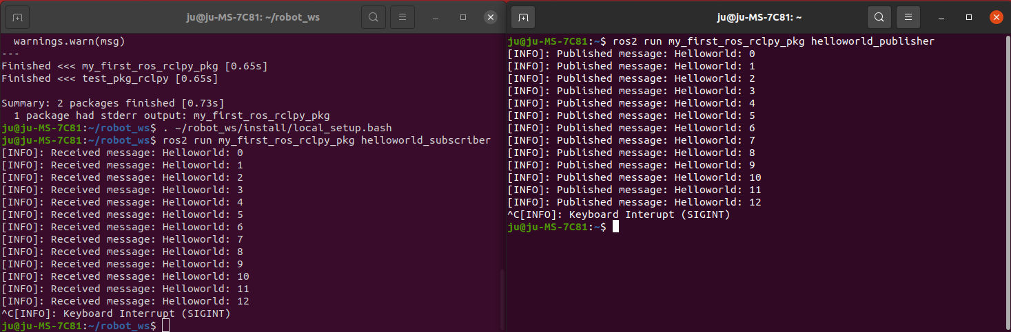 이번주에는 ROS2 책을 통해서 기본 내용들을 파악하고 Helloworld 메시지를 publish, subscribe하는 실습을 통해 통신에 필요한 기초구성, 문법을 공부하였다.
