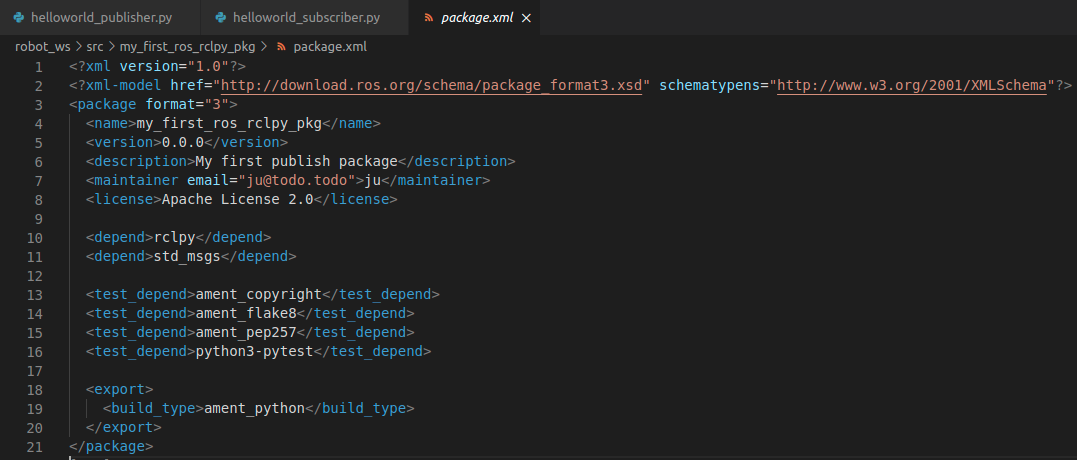 package.xml파일을 통해서 패키지의 중요 내용(패키지 이름, 종속 파일들 선언)들을 작성하고