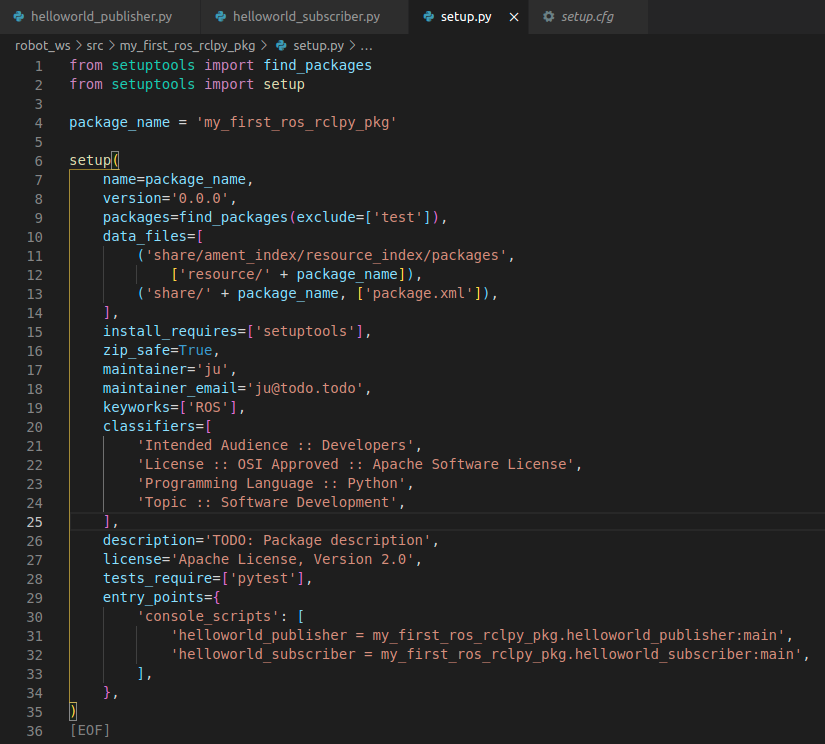 ROS1과 달리 ROS2에서는 python을 완전히 독립시켜 관리한다. 때문에 python으로 작성시 CMakeList파일이 존재하지 않는다.