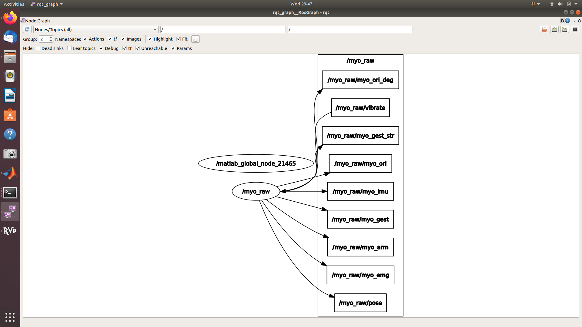 $ rqt_graph로 확인해보면 아래처럼 matlab노드와 myo노드가 생성되고 myo노드로부터 여러 토픽을 통해서 raw데이터들이 생성되고 있음을 볼 수 있다.