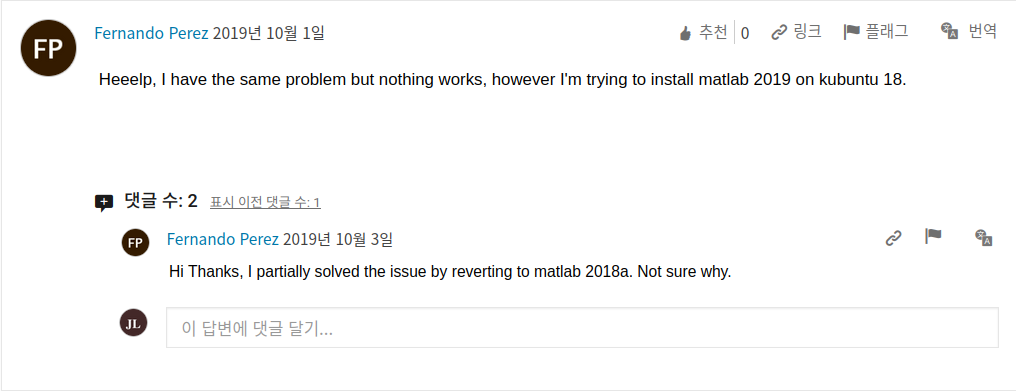 이후 블로그(https://likecode.tistory.com/258)를 참고하여 진행하였지만 matlab intstaller가 실행되지 않았다. 검색했을 때 matlab에서 권한 문제같다는 답변(https://kr.mathworks.com/matlabcentral/answers/229857-why-do-i-see-preparing-installation-files-installing-finished-in-the-terminal-window-wh)을 보았지만 결국 해결되지 않았고 그 아래에 있던 댓글을 참고하여 최신 버전이 아닌 2020버전으로 하니 해결되었다.