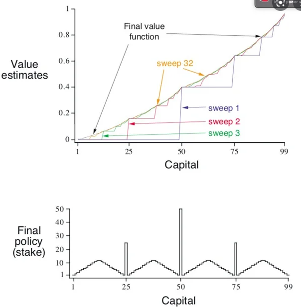 1. Optimal Policy 그래프가 보다 더 교재처럼 이쁘게 나오려면 동전이 앞면이 나올 확률(승률)을 0.4에서 0.25로 줄이면 보다 교재와 가까운 그래프를 얻을 수 있다.