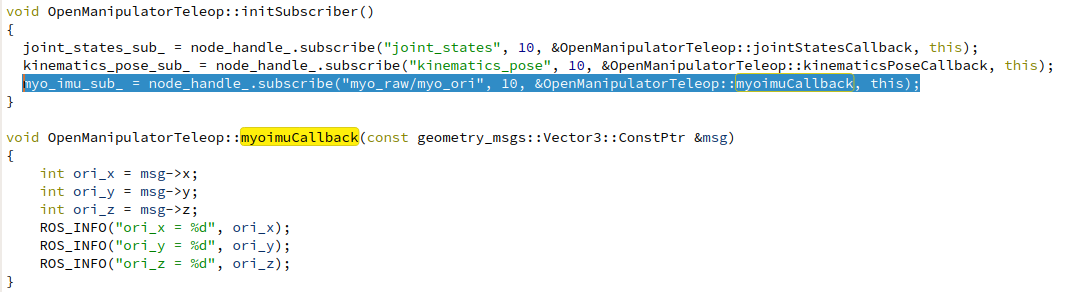 1) subscriber 구현함수아래에 myo_ori데이터 받을 sub 만들 코드 추가