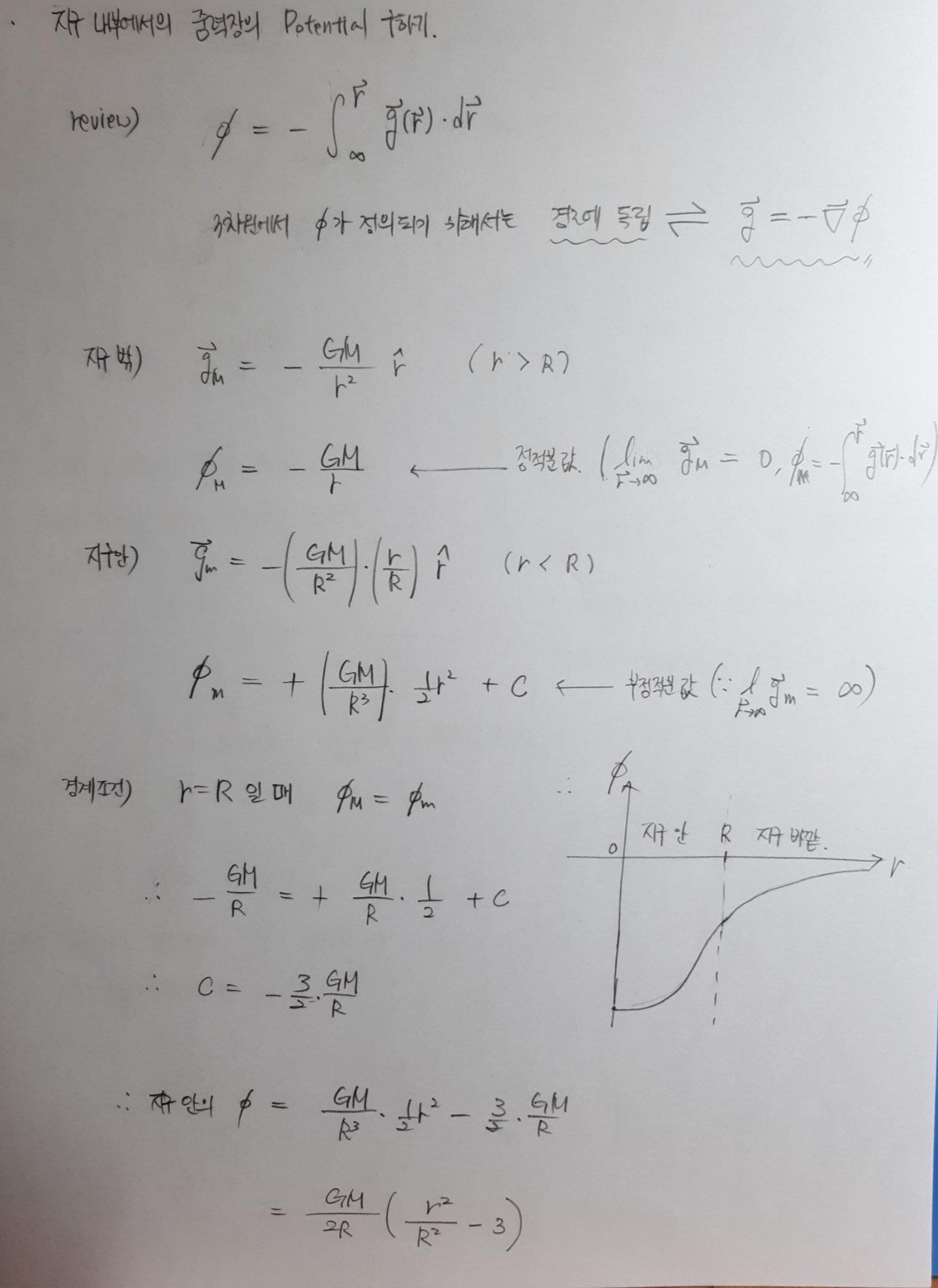 이에 따라 지구 바깥에서의 퍼텐셜과 지구 내부의 퍼텐셜을 각각 구하면 외부는 정적분값으로 나오고