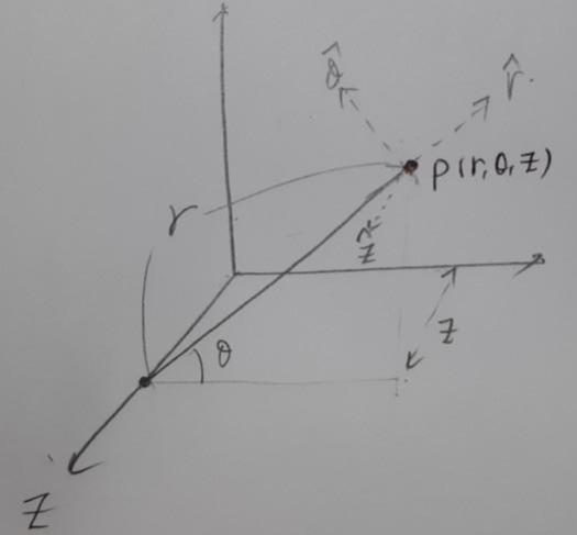 자 이렇게 원통좌표계는 r, z, 세타를 가지고 공간에 위치한 점p를 나타냅니다.