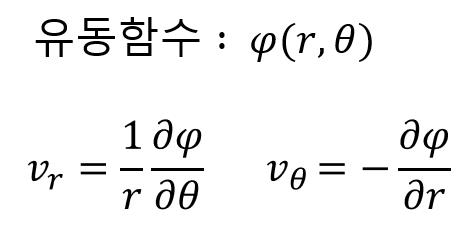 여기서 또한 유동함수를 정의할 수 있고 비압축성, 2차원 유동의 연속방정식을 만족합니다.
