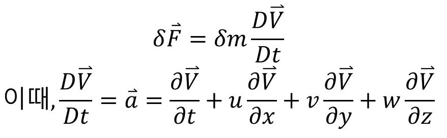 좌변은 본 글에서 구한 힘들의 합, 우변은 유체의 운동학에서 물질미분으로 구했던 유체의 가속도입니다.