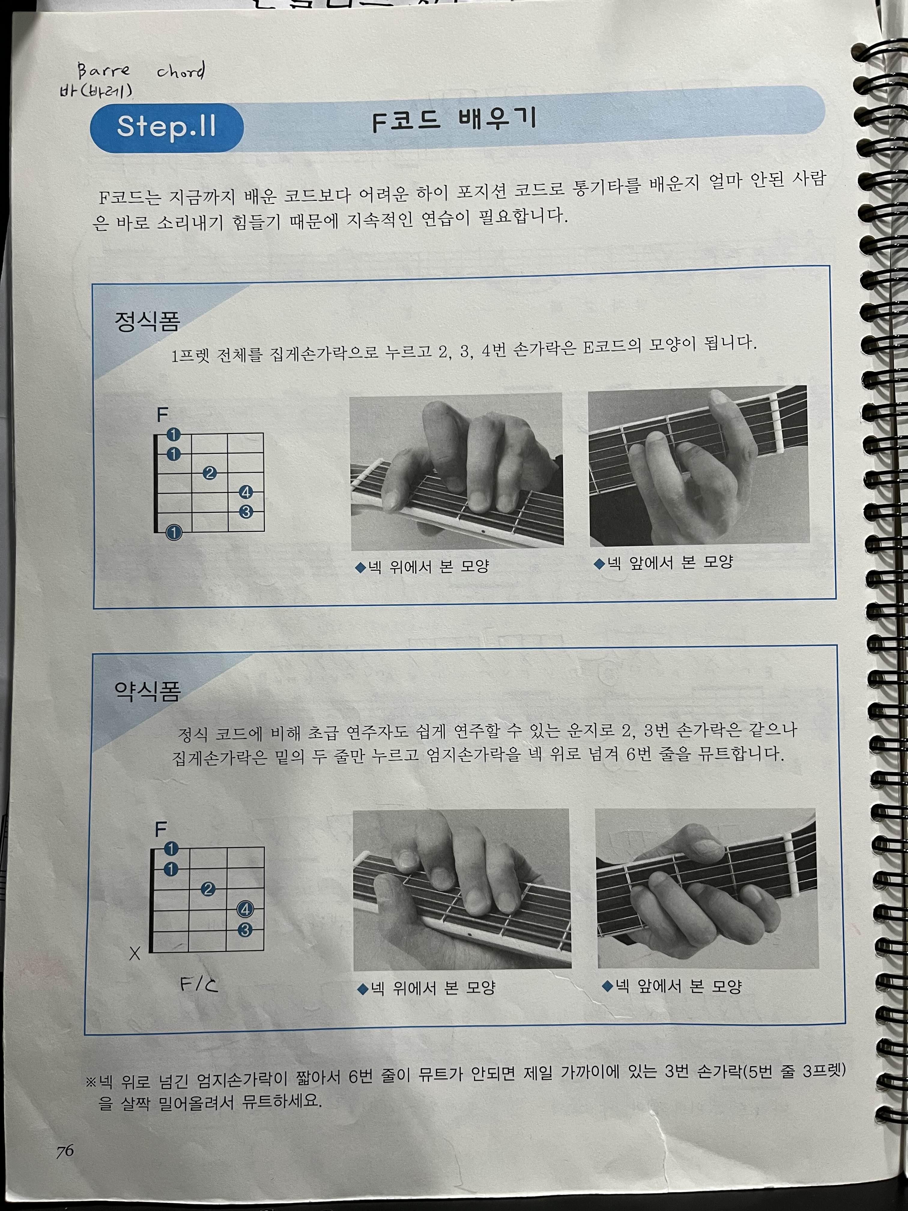 F코드 빠르게 잡는법 : 기타를 좀 더 사선 방향으러 내밀어 팔 공간을 늘리고 몸을 숙인다. 근음을 먼저 잘 잡을 수 있도록
