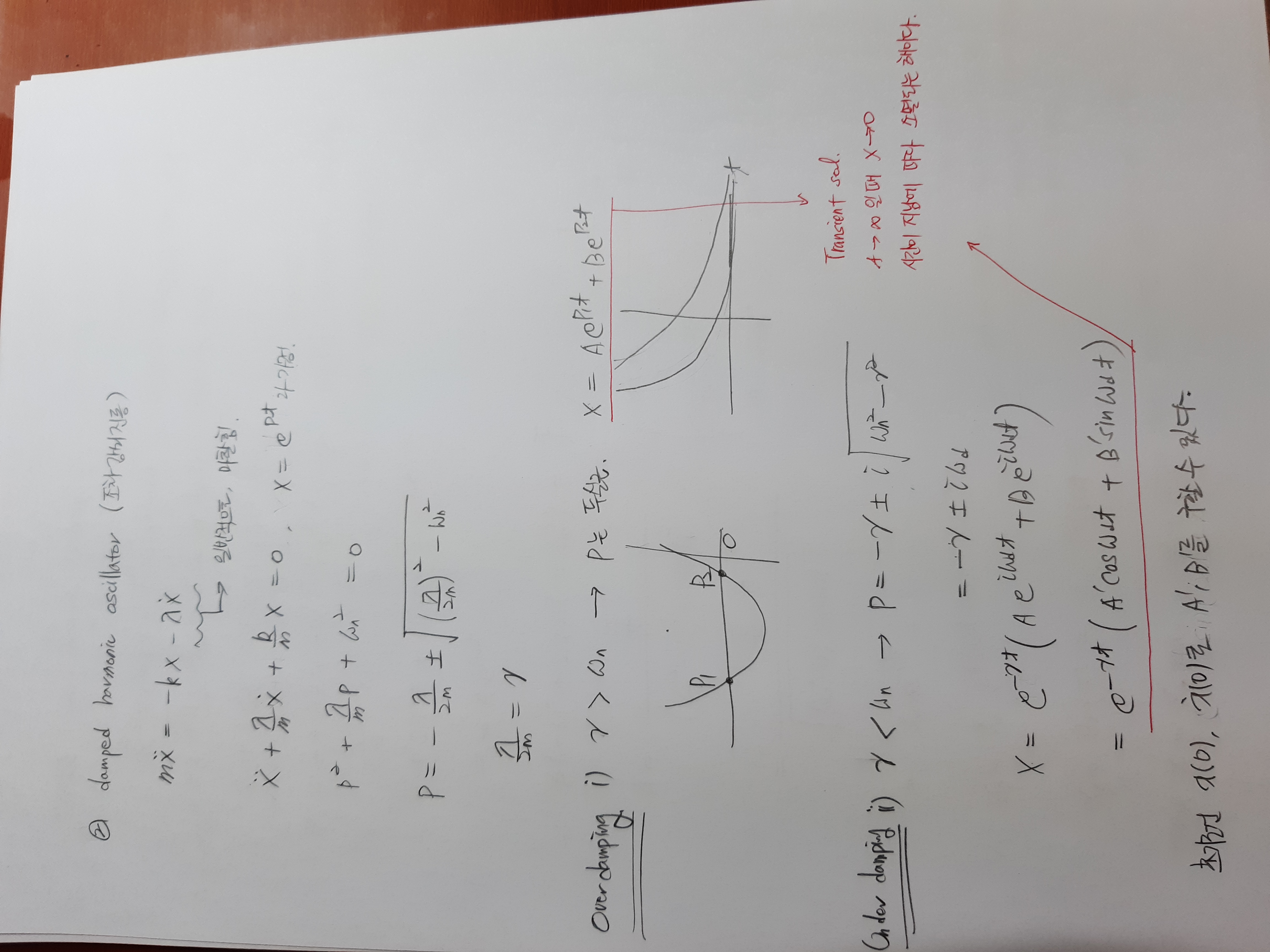 2)조화감쇠진동인 m-c-k시스템에는 daming항(c항)이 존재하고 이는 일반적으로 마찰힘입니다. 이 경우 점차 진동이 줄어들 것을 물리적으로 생각할 수 있습니다. 그 해를 보면 exp(-rt)가 있어 t가 무한대로 가면 모두 x=0으로 감을 확인할 수 있습니다.