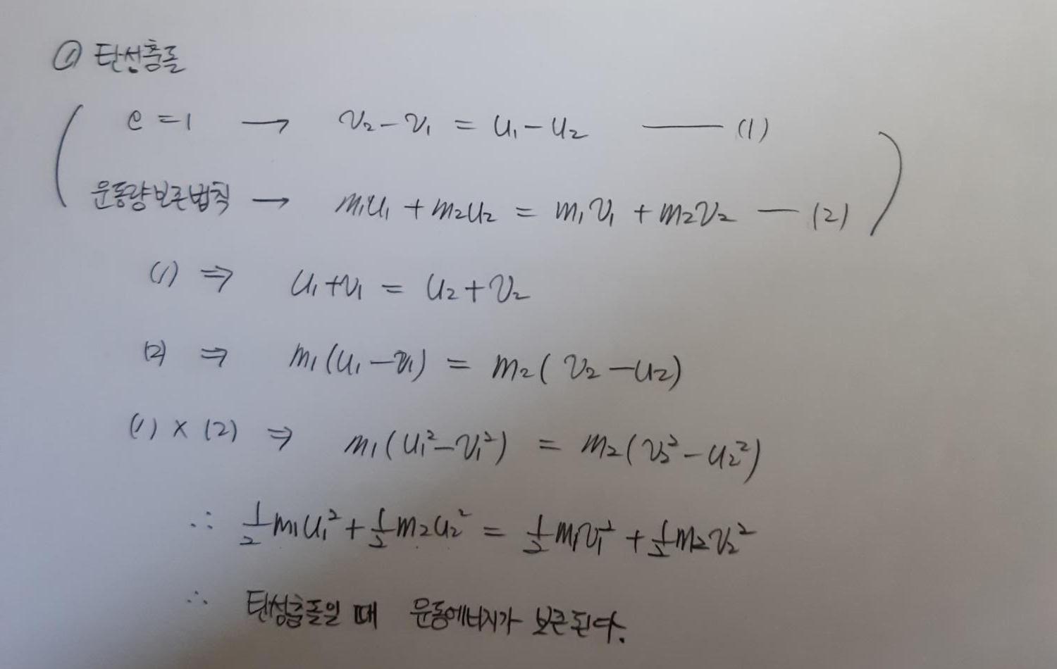 탄성충돌일 경우에는 운동에너지보존법칙이 성립하고